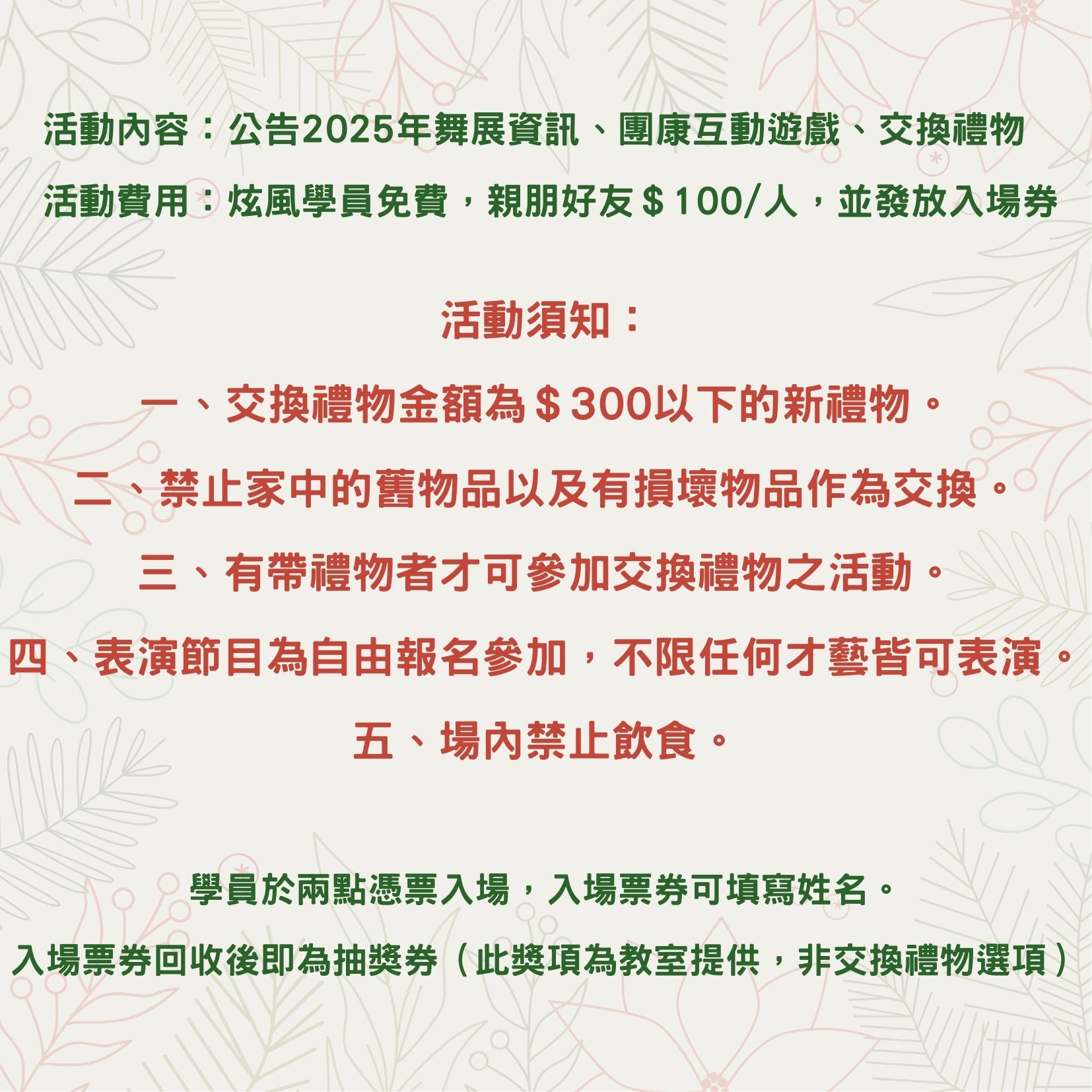 活動內容:公告2025年舞展資訊、團康互動遊戲、交換禮物