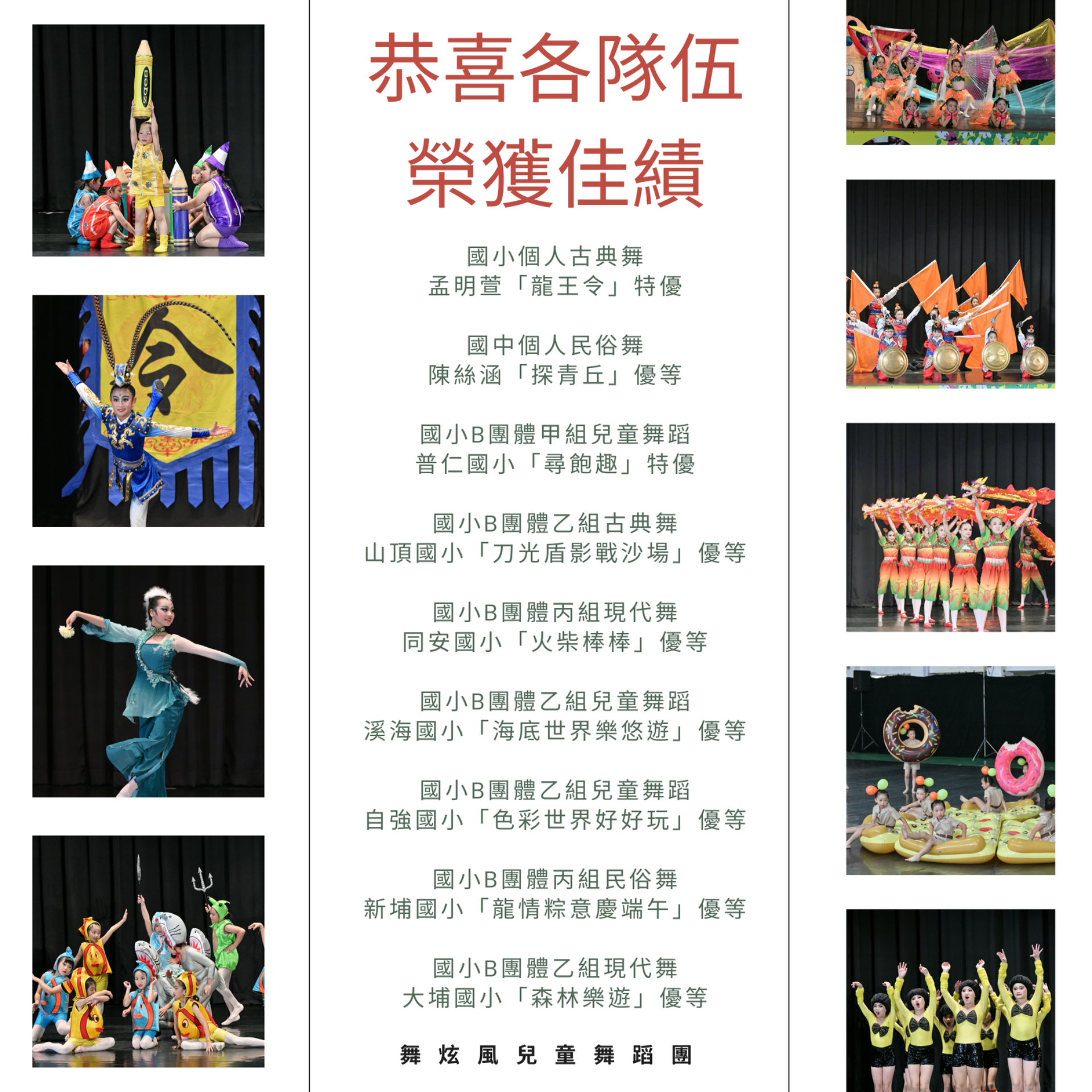 舞炫風教師團隊由汪美岑老師領軍,在113年桃園市全國學生舞蹈比賽鐘帶領學生再創佳績。